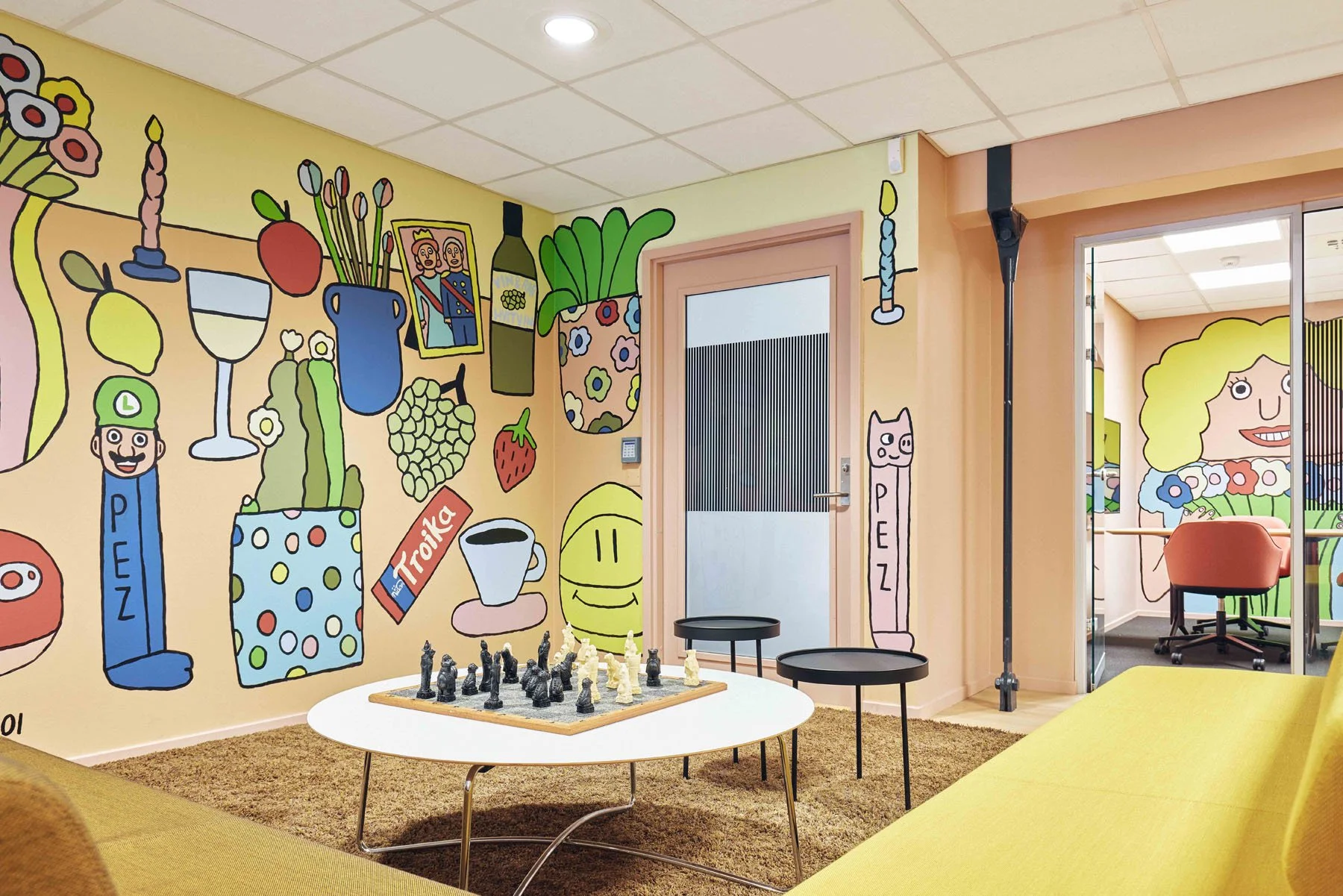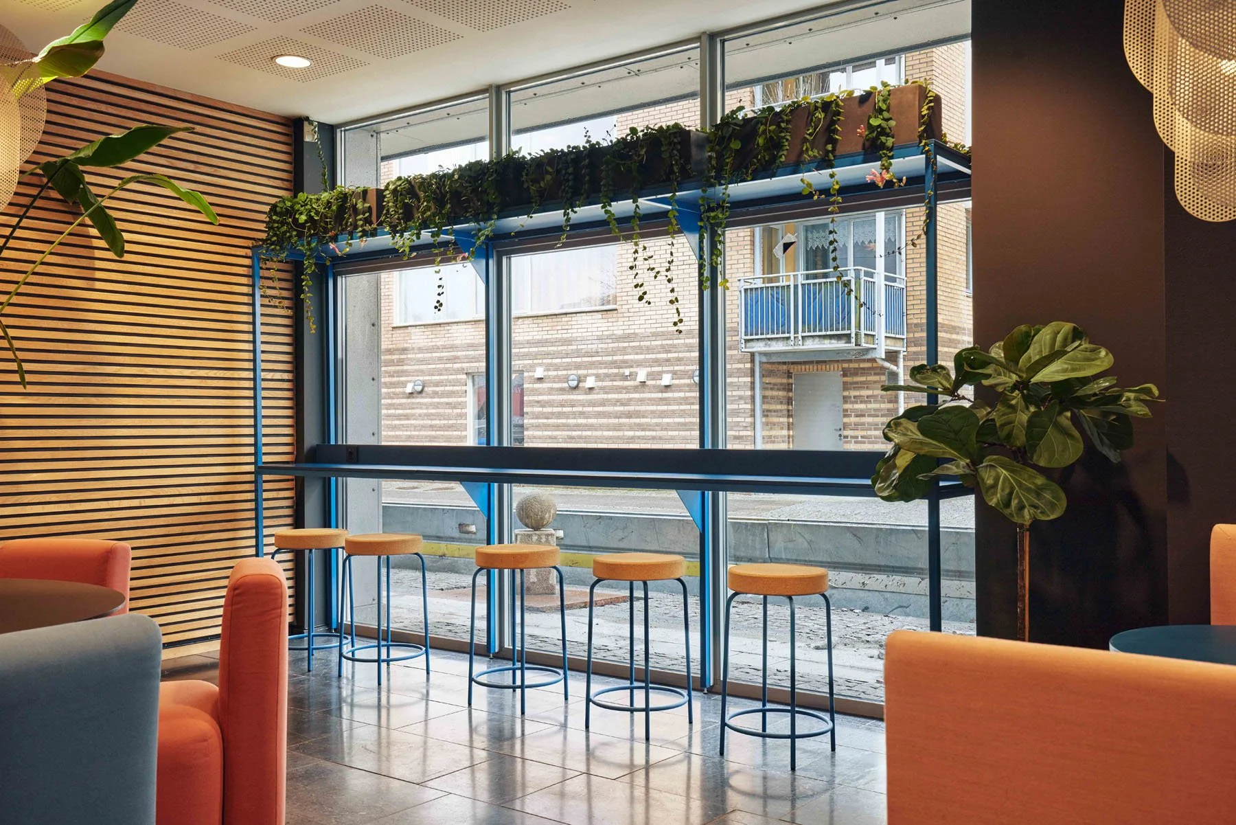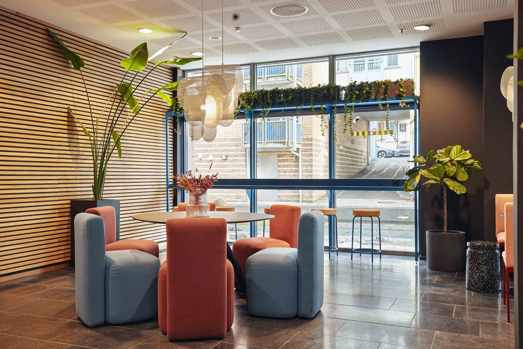 Interiørkonseptet er basert på tidløse kvaliteter med en tvist. Bygget har sorte fliser og eikespiler og hadde tidligere hvite og svarte vegger. Nå er det lunere og sprekere med farger og mønster og nye materialer.