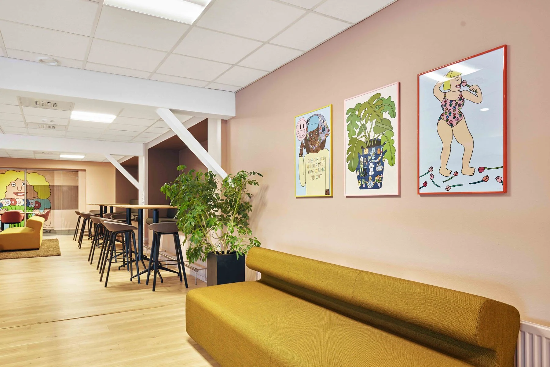 Første etasje i kantinen er mest formell, på mesanin er det kunstverk av Anette Moi.